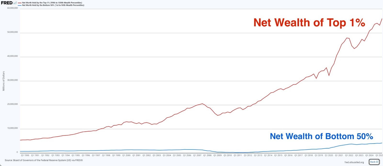 Devido ao uso excessivo da impressão monetária, que provoca o efeito Cantillon, os ricos estão cada vez mais ricos e a classe média está a ser dizimada, aumentando exponencialmente a classe baixa. Uma desigualdade como nunca antes vista.